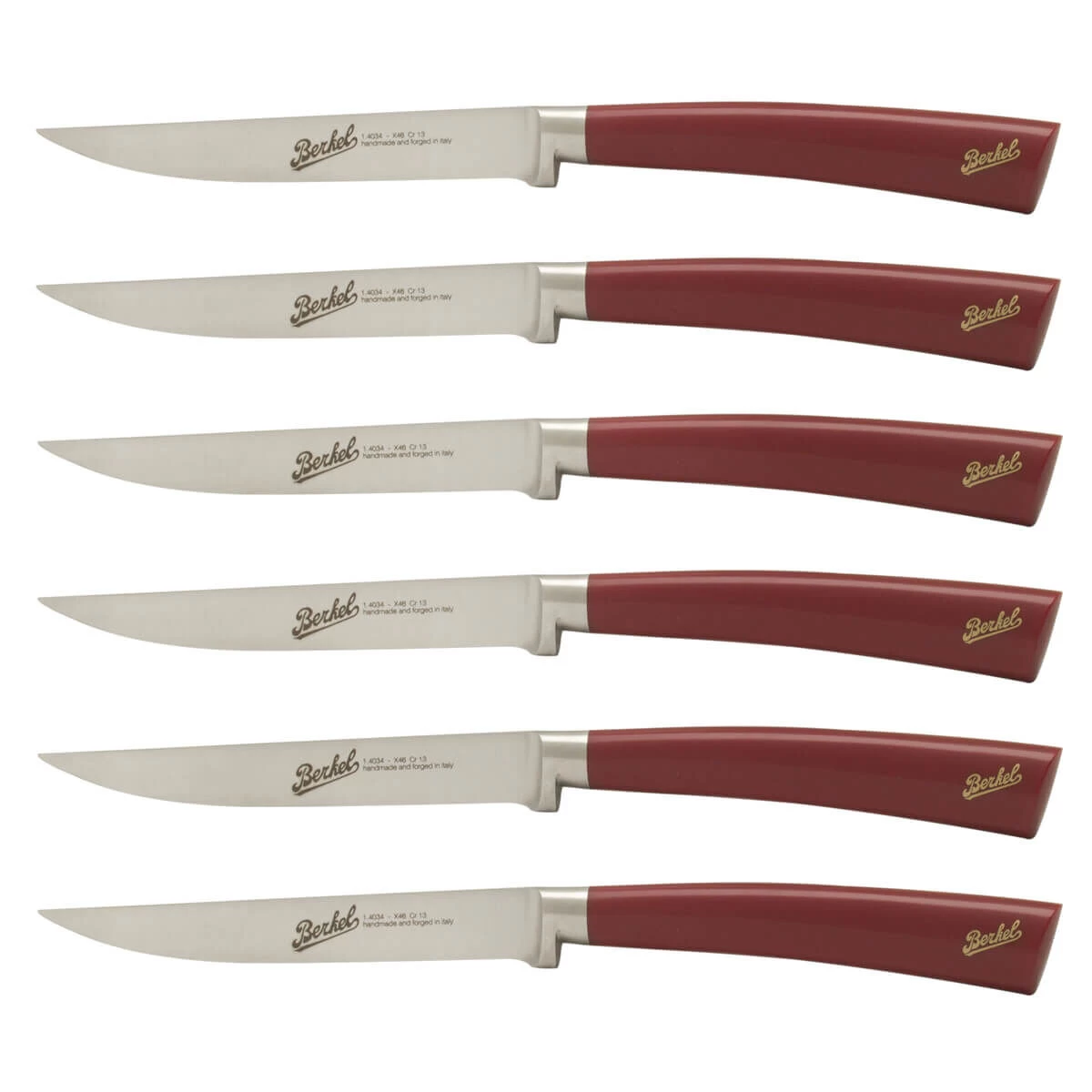 De Berkel Elegance Elegance steakmessenset bestaat uit 6 messenstalen steakmessen die zijn voorzien van een organisch gevormd rood kunststof heft. De messen hebben ieder een lemmet van 11 cm en zijn in hun geheel 22,5 cm lang. Gebruik de steakmessen als tafelmes bij het serveren van biefstuk en andere vleesgerechten.