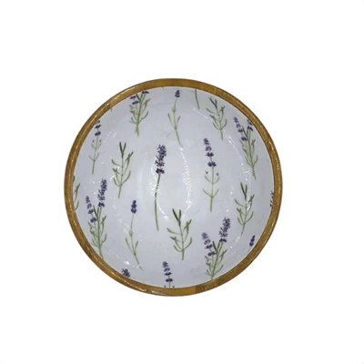 Op zoek naar een stijlvolle schaal om (zomerse) salades of andere gerechten te serveren? Dit exemplaar van By Room is er één voor op uw wensenlijst! Het item is vervaardigd uit mangohout en heeft een rond design met een diameter van 18 cm. De binnenkant is voorzien van een sticker met lavendelprint voor een speels effect. Combineer de schaal met het bijpassende slacouvert voor een elegant geheel.