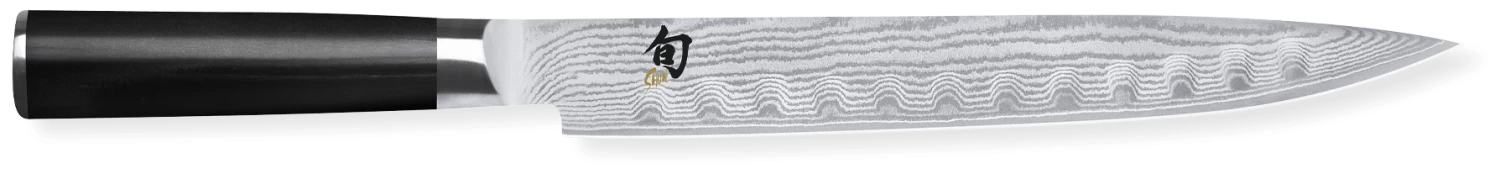 Het Kai Shun Classic trancheermes heeft een lemmet van 23 cm en is gesmeed uit 32-laags damaststaal. Het materiaal zorgt voor een sierlijke nerfstructuur in het lemmet. Het mes is geschikt voor het snijden van vlees en gevogelte tijdens het serveren. Het lemmet is voorzien van kuiltjes die luchtkussentjes vormen tijdens het snijden. Hierdoor blijven uw ingrediënten niet aan het mes plakken en kunt u dunner snijden.