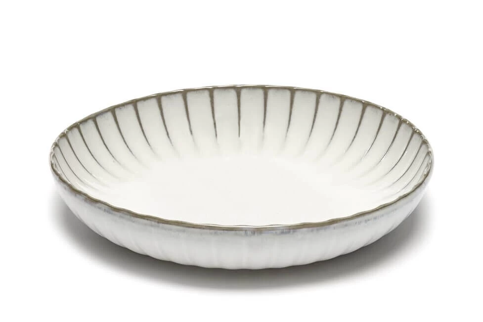 Het hoge bord M van Serax INKU heeft een diameter van 23 cm en is 4,5 cm hoog, en is aan de rand voorzien van een decoratief ribbelpatroon. De schaal is gemaakt van steengoed (aardewerk) en is wit geglazuurd. Gebruik voor het serveren van gerechten.