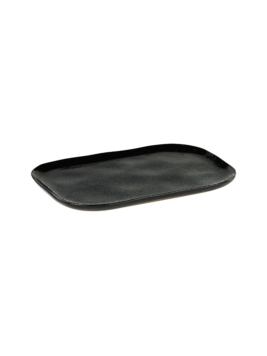 Het rechthoekige Merci bord van Serax is gemaakt van donkerblauw geglazuurd zandsteen. Het bord is 23 cm lang, 15 cm breed en 1,4 cm hoog.Â